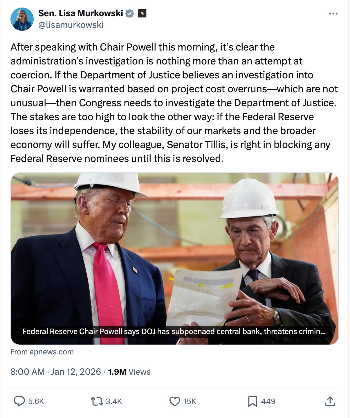 Republican Senator Lisa Murkowski echoed his concern after speaking directly with Powell, also posting on X: